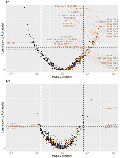 Volcano plots illustrating sex-specific plasma metabolite patterns associated with the VO2peak. F: females; M: males. * confounder (age/menopausal status)-adjusted. The y-axis represents the significance of the contribution of each metabolite variable to the multivariate association with the VO2peak, expressed as the negative logarithm of the relative frequencies of permutation-obtained rank products below measured rank products. The x-axis illustrates the direction and strength of partial correlations between the VO2peak and metabolite variables, expressed as Pearson correlation coefficients (r) of Van der Waerden (VdW)-transformed variables. The classification of plasma analytes to major metabolic pathways is color-coded as follows: amino acid metabolism (dark blue); carbohydrate metabolism (yellow); cofactors and vitamins metabolism (dark green); energy metabolism (light blue); lipid metabolism (brown); mammalian-microbial cometabolism (orange); nucleotide metabolism (purple); xenobiotics and related metabolism (light green); unknown (black).