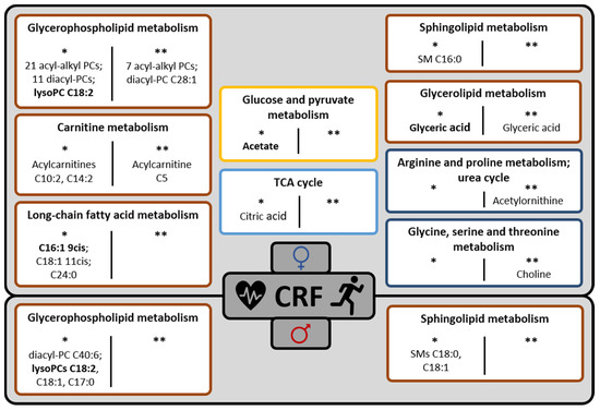 Classification of relevant CRF-associated plasma metabolites to major and specific metabolic pathways. Top: females; bottom: males. Major metabolic pathways are color-coded as follows: amino acid metabolism (dark blue); carbohydrate metabolism (yellow); energy metabolism (light blue); lipid metabolism (brown). * findings from confounder (age/menopausal status)-adjusted bi-/multivariate association analyses; ** findings from bivariate association analyses additionally adjusted for phenotypical/clinical variables. CRF: cardiorespiratory fitness; PC: phosphatidylcholine; SM: sphingomyelin. Metabolites with bivariate correlations to CRF that were significantly different from zero in both females and males are indicated in bold.