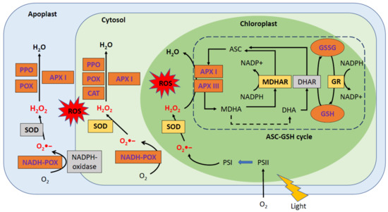 We previously summarized that PPV infection is caused an oxidative stress in chloroplasts by ROS accumulation. The antioxidant system, which includes enzymatic and nonenzymatic defense systems, is responsible for maintaining the balance of ROS detoxification and production. The first defense mechanism in plants is the enzyme superoxide dismutase (SOD), which involves the transformation of the superoxide anion (O2•−) into H2O2, preventing the formation of the hydroxyl radical (•OH). Subsequently, a combination of enzymes such as peroxidase (POX), catalase (CAT), ascorbate peroxidase (APX), and glutathione peroxidase (GPX) can convert the generated H2O2 into H2O. In addition, glutathione S-transferase (GST) and polyphenol oxidase (PPO) are also implicated in ROS detoxification. However, the ascorbate-glutathione cycle (ASC-GSH cycle) is the predominant antioxidant defense pathway responsible for H2O2 detoxification. This cycle is composed by nonenzymatic antioxidants, such as ascorbate acid (ASC) and glutathione (GSH), as well as four important enzymes: ascorbate peroxidase (APX), monodehydroascorbate reductase (MDHAR), dehydroascorbate reductase (DHAR), and glutathione reductase (GR) [14].