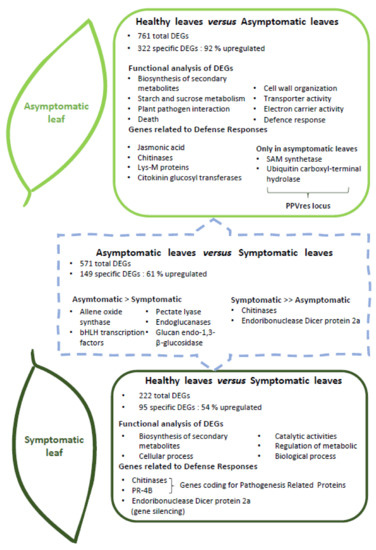 Rubio et al. [20] were the first authors to compare healthy, asymptomatic, and symptomatic leaves during PPV infection in peaches (GF-305). This study provided a global picture of the peach transcriptome after PPV infection and the development of sharka symptoms. In fact, transcriptome modifications were induced by the PPV infection but differ according to the type of tissue, with or without symptoms. Asymptomatic leaves presented a greater number of deregulated genes as a result of PPV infection than symptomatic leaves. Furthermore, 92% of specific differentially expressed genes (DEGs) were upregulated in asymptomatic leaves, while only 54% were upregulated in symptomatic leaves. The different trends between symptomatic and asymptomatic leaves are summarized in Figure 2.