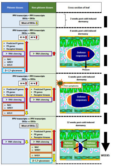 In conclusion, Collum et al. [25] described the alterations caused by the PPV infection and revealed that these changes were dynamic. In the early stages, phloem tissues displayed a significantly higher level of response to PPV infection than non-phloem tissues, regardless of the similar levels of the viral transcripts. In contrast, in mature 12-week-old leaves, the non-phloem tissues became the predominate altered tissue. Interestingly, the increase in plant defense responses was related to the presence of active viral infection, particularly induced in phloem tissues between weeks 4 and 6. The PPV infection induced a temporal and spatial coordination of the defense responses in phloem and non-phloem tissues and revealed the importance of phloem responses within a perennial host.