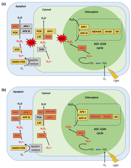 In peaches, the chloroplast presented an increase in both class III APX and class I APX activities [9,17], where only the APX enzyme was capable of scavenging H2O2 in the chloroplast [14]. In contrast, significant decreases in SOD, MDHAR, and GR activities were measured by Hernandez et al. [9,17]. The increase in APX activity could be a delayed stress response and would thus not be capable of avoiding the accumulation of H2O2. In addition, the decrease in SOD activity could promote ROS accumulation. In apricots, PPV infection produced a decrease in the four enzymes of the ASC-GSH cycle. Concerning SOD activity, the results revealed an increase, which is opposite to what was observed in peaches [12,17]. The altered ASC-GSH cycle, which contributes significantly to H2O2 removal, could be responsible for H2O2 accumulation. These alterations may promote PPV-induced oxidative stress in peach and apricot chloroplasts.