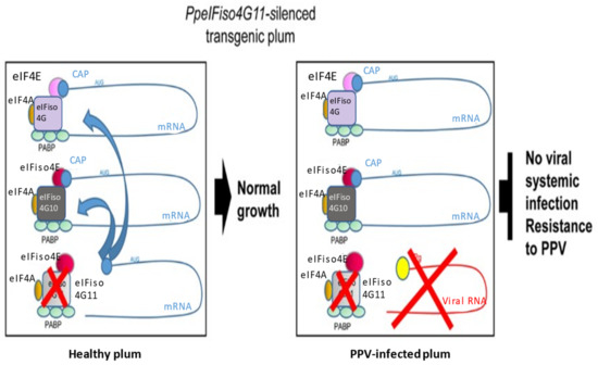 Two loci on the eIFiso4E gene (named PpeIFiso4G10 and PpeIFiso4G11) were detected by a BLAST analysis. A reduction in the expression of PpeIFiso4G11 allowed one of the transgenic plants to resist infection by PPV-M and PPV-D. In addition, this resistance could be transmitted to grafts of the plant, which seems to indicate that this resistance is stable and durable. In addition, the decrease in expression of one of the genes encoding for the initiation factor eIFiso4G is linked to the production of specific 21–24-nt siRNAs, interfering with the production of PpeIFiso4G11. An infection model was thus created in which the PPV hijacks the eIFiso4F factor. If the transcription factor is not present, the PPV will not be able to use the transcription factor to replicate itself. However, the cell will still be able to recruit other transcription factors to continue normal cellular activities (see Figure 6).