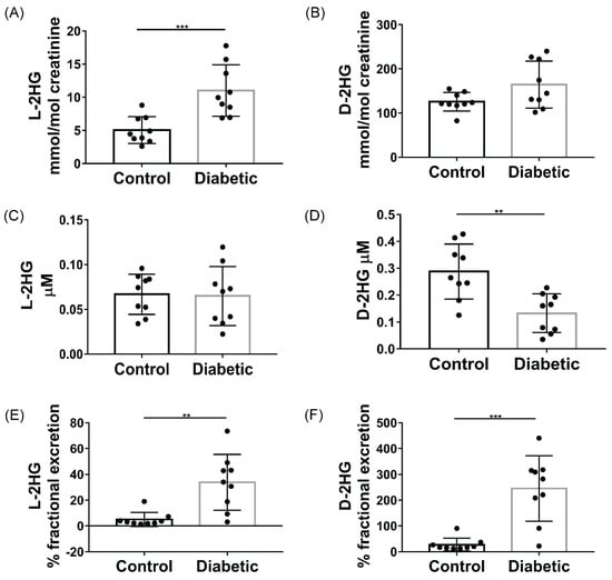 Concentration of L and D-2HG (±SD) in plasma and urine and calculated percent fractional excretion of each metabolite from Control (db/+) and Diabetic (db/db) and mice. (A) Urinary L-2HG and (B) Urinary D-2HG levels normalized creatinine, (C) plasma L-2HG levels, (D) plasma D-2HG levels, (E) % fractional excretion of L-2HG, (F) % fractional excretion of D-2HG. Student’s t-test, ** = p-value ≤ 0.001, *** = p-value ≤ 0.0001.