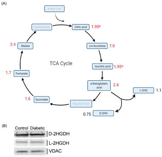 Kidney cortex levels of TCA cycle metabolites drive D and L-2HG production. (A) Schematic of TCA cycle with fold change (Control db/+ vs. diabetic db/db) denoted (red if p ≤ 0.05 and black if did not meet significance). Metabolites in gray were not measured in the study. *: Citrate and isocitrate were measured as one transition. (B) Western blot of db/+ and db/db cortex for D-2HGDH, L-2HGDH, and VDAC (n = 4). Figure 2A was created with BioRender.com.