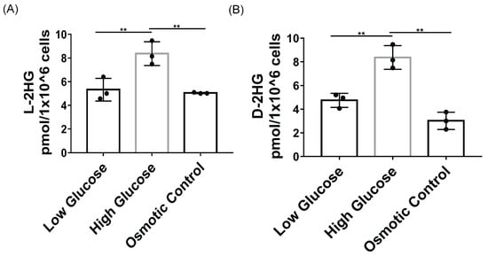 HK-2 production of D and L-2HG in high glucose media. (A) L-2HG and (B) 2-HG levels from HK-2 cells cultured in 5 mM glucose (low glucose), 25 mM glucose (high glucose), 5 mM glucose with 20 mM mannitol (osmotic control). One-way ANOVA with Tukey’s post hoc correction, ** = p-value ≤ 0.01.