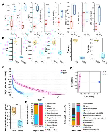 After 21 days of antibiotic treatment, five healthy chickens with similar body weight were selected from the control group (NFD, n = 5), and five healthy chickens with similar body weight were selected from the antibiotic-treated groups (NFDA, n = 5), respectively. Blood samples were collected by venipuncture, and serum was obtained by centrifugation and stored at 4 °C. The liver tissues were collected, placed in microcentrifuge tubes, flash-frozen in liquid nitrogen and stored at −80 °C until further analysis. The abdominal fat tissues were isolated, and the AFW was weighed to calculate the abdominal fat rate (AFR): AFR = AFW/BW × 100%. The cecal contents were collected by gently squeezing the contents from the tissue into a sterile collection tube.