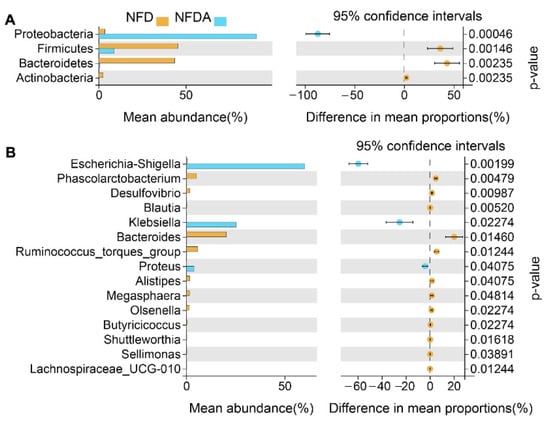 Differential taxa (phyla and genera) between control (n = 5) and antibiotic treatment (n = 5) groups. (A) Differential phyla. (B) Differential genera. p < 0.05 indicates significant difference. NFD (n = 5), NFDA (n = 5).