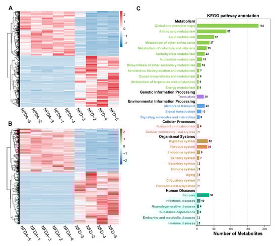 Identification and functional annotation of differential metabolites. (A) Clustering heatmap of differential metabolites in positive ion mode. (B) Clustering heatmap of differential metabolites in negative ion mode. The red, white and blue colours represent relative abundance from high to low. (C) KEGG pathway annotation of differential metabolites. NFD (n = 4), NFDA (n = 5).