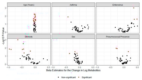 Continuous variables are presented as median and IQR, and categorical variables are presented as counts and percentages. The quantified metabolite data were log transformed to achieve a normal distribution of the data to conduct parametric statistical analysis [,]. Only metabolites that were reported in at least 90% of the samples were included in the analysis. For other metabolites, if levels were undetected or missing, a complete case analysis was performed. For each metabolite, we estimated the between-subject and within-subject variability by using linear mixed models. Metabolite concentration was the dependent variable, and a random effect was included for subject and time nested within subject. The covariance matrix for the random effects was specified to be compound symmetric [,]. Using these variance components, we estimated the intraclass correlation (ICC), along with the ratio of between-subject variance and total variance. Thus, a low ICC indicates that there is more variability in the metabolome within a subject than between subjects. We examined the associations with age, time, asthma, Sp presence, viral detection, and age–time interaction by including these variables as fixed effects in the linear mixed models. To account for multiple testing for the multiple metabolite outcomes, we used the Benjamini–Hochberg false discovery rate procedure []. All tests were conducted in R version 4.0.4 (2021-02-15) (R Core Team 2020). GGplot2 was used to create all graphics []. ICC and random effects models were created using the lme4 and lmerTest packages [,].