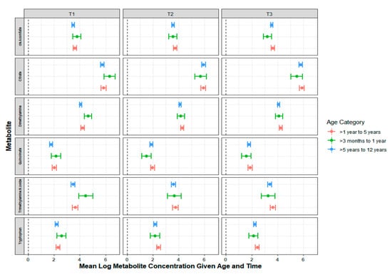 Least square means and corresponding 95% confidence intervals of the log values for the metabolites (concentration in µM) with a significant age–time interaction from the linear mixed model. Each column presents a unique time point (T1 indicating the initial visit, T2 indicating 24 h after the initial visit, and T3 indicating 10–14 days after the initial visit); metabolites are presented in rows. Children aged >3 months to 1 year represent 5.7% (n = 7), >1 year to 5 years represent 32% (n = 39), and >5 to 11 years old represent 62.3% (n = 76) of the total study cohort. Each colored data point represents a different age category.