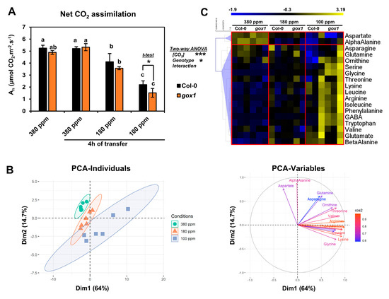 Figure 1. The effect of short-term low CO2 treatments (180 and 100 ppm for 4 h) on net CO2 assimilation rate and amino acid contents of Arabidopsis Col-0 and gox1 rosette leaves. (A) Net CO2 assimilation rate before (380 ppm) and after exposure to an atmosphere with 380, 180 or 100 ppm CO2 (4 h treatment). (B) Principal Component Analysis of amino acid contents of Col-0 and gox1 rosette leaves after a 4 h exposure to an atmosphere with 380, 180 or 100 ppm CO2. (C) Hierarchical clustering of amino acid contents based on Pearson’s correlation coefficients. Results are expressed as the mean ± standard deviation of three independent biological replicates. Different letters indicate groups of mean values that are significantly different between the conditions (two-way ANOVA test followed by a post-hoc Tukey HSD test, p-value < 0.05). Ellipses on the PCA plots represent the 95% confidence intervals. *** p-value < 0.001; * p-value < 0.05.
