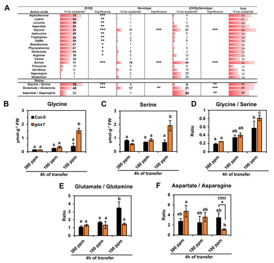 Figure 2. Statistical analyses of amino acid variations associated with short-term exposure to low CO2 (180 and 100 ppm for 4 h) in wild-type and gox1 Arabidopsis thaliana Col-0. (A) Two-way ANOVA analysis of amino acid contents from rosette leaves of Col-0 and gox1 plants after 4 h of exposure to an atmosphere with 380, 180 or 100 ppm CO2. (B) Glycine and (C) Serine contents, (D) Glycine/Serine, (E) Glutamate/Glutamine and (F) Aspartate/Asparagine ratios. Results are expressed as the mean ± standard deviation of three independent biological replicates. Different letters indicate groups of mean values that are significantly different between the different conditions (two-way ANOVA test followed by a post-hoc Tukey HSD test, p-value < 0.05). *** p-value < 0.001; ** p-value < 0.01; * p-value < 0.05. Var = Variance.
