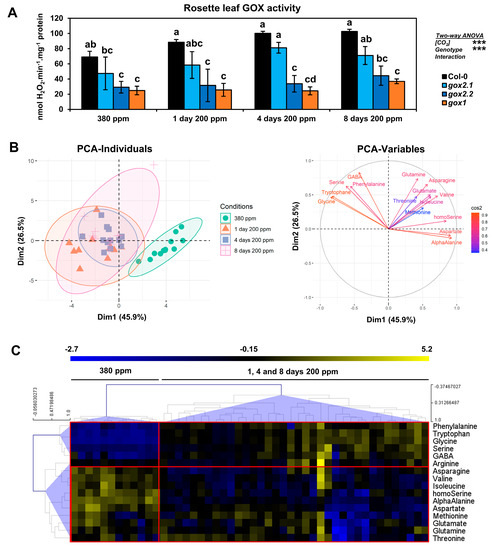 Figure 3. The effect of a long-term low CO2 treatment (200 ppm) on rosette leaf GOX activity and amino acid levels of Arabidopsis Col-0, gox1 and gox2 mutants. Plants were exposed to an atmosphere containing 200 ppm CO2 for either 1, 4 or 8 days. (A) Rosette leaf GOX activity, (B) principal component analysis of amino acid contents, (C) hierarchical clustering of amino acid contents based on Pearson’s correlation coefficients. Results are expressed as the mean ± standard deviation of three independent biological replicates. Different letters indicate groups of mean values that are significantly different between the different conditions (two-way ANOVA test followed by a post-hoc Tukey HSD test, p-value < 0.05). Ellipses on PCA plots represent the 95% confidence intervals. *** p-value < 0.001.