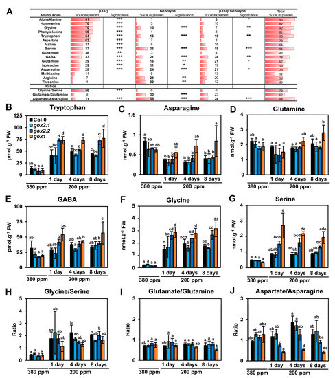 Figure 4. Statistical analyses of amino acid variations associated with long-term low CO2 treatment (200 ppm) in gox1 and gox2 mutants. (A) Two-way ANOVA analysis of amino acid contents from rosette leaves of Col-0, gox1 and gox2 mutants after 1, 4 or 8 days of exposure to an atmosphere with 200 ppm of CO2. (B) Tryptophan, (C) asparagine, (D) glutamine, (E) GABA, (F) glycine and (G) serine contents. Ratios for (H) glycine/serine, (I) glutamate/glutamine, (J) aspartate/asparagine. Results are expressed as the mean ± standard deviation of three independent biological replicates. Different letters indicate groups of mean values that are significantly different between the different conditions (two-way ANOVA test followed by a post-hoc Tukey HSD test, p-value < 0.05). *** p-value < 0.001; ** p-value < 0.01; * p-value < 0.05. Var = Variance.