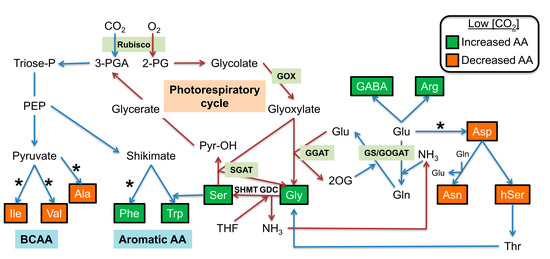 Their extractable leaf GOX activities and this will be discussed below (see Section 3.3). However, not only photorespiratory-associated amino acids were affected by a low CO2 atmosphere. Both low CO2 treatments resulted in the depletion of Ala and Asp in all lines thus identifying them along with Gly and Ser as important markers of low CO2/high photorespiration (Figure 1 and Figure 3; Tables S1 and S2). In addition to these major amino acids, some minor amino acid pools including Arg, branched-chain and aromatic amino acids were also modulated by low CO2 (Figure 1, Figure 3 and Figure 5; Tables S1 and S2). It might be expected that under low CO2 conditions, less carbon is available for N-assimilation and amino acid biosynthesis thereby decreasing amino acid pool sizes. This was clearly not the case since a number of amino acid pool sizes increased. This can happen because either they are being used less or being produced more. It should be noted that variations of amino acid pool sizes are clearly not always correlated with intuitive variations of their associated metabolic fluxes [39].