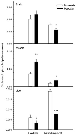 Relative membrane cholesterol in the tissues of normoxic controls and hypoxia-acclimated animals for two hypoxia-tolerant vertebrates: the goldfish [14] and the naked-mole rat [15]. Values are means ± SEM (n = 9–16 per treatment). * p < 0.05, ** p < 0.01, *** p < 0.001 indicate significant effects of hypoxia.