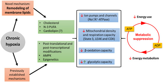 Remodeling of membrane lipids is a proposed new mechanism to promote metabolic suppression in chronic hypoxia. Prolonged in vivo exposure to low oxygen alters the relative abundance of membrane cholesterol, n-3 polyunsaturated fatty acids (PUFA), and possibly mitochondrial cardiolipin in ways that downregulate ion pumps such as Na+/K+-ATPase (a major ATP consumer), ion channels, and possibly mitochondrial respiration capacity [state 3 (OXPHOS in the presence of substrates and ADP) and LEAK (proton leak)]. Chronic hypoxia also causes a general reduction in cytochrome c oxidase (COX) indicating a decrease in mitochondrial density. The observed changes in membrane composition are known to modulate metabolic pathways of energy metabolism such as β-oxidation (downregulation) and glycolysis (up or downregulation). Reduction of flux through the ATP-ADP cycle can also be induced by previously characterized mechanisms that involve post-translational/post-transcriptional modifications [11], 5′-AMP-activated protein kinase (AMPK) [12] or epigenetic changes [13]. Membrane remodeling and established mechanisms work in concert to cause metabolic suppression.