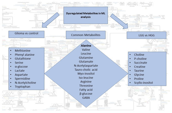 Summary of dysregulated metabolites identified by the two sets of ML analysis i.e., glioma vs control and LGG vs HGG. Common metabolites can potentially be used for both detection and classification of gliomas.