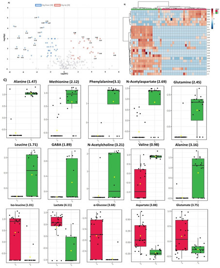 Dysregulated metabolites contributing to significant spectral regions for both groups of analysis and common in two comparison sets are summarized in Figure 3. Alanine was the only metabolite detected by all the three ML models for glioma detection. Other important metabolites for glioma detection included methionine, phenylalanine, glutathione, serine, glucose, lactate, aspartate, NAA, and tryptophan. For glioma classification in low and high grades, choline, p-choline, succinate, creatine, taurine, glycine, proline, and scylloinositol were regarded as the key metabolites. The fold-change and mean intensity values for selected dysregulated metabolites, in all three study groups, are presented in Figure 4 in the form of heatmaps, volcano, and box and whisker plots.