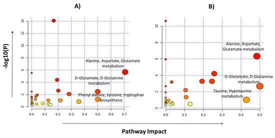 Metabolites of interest, quantified by selected distinctive unbiased NMR signals and identified to be important after ML-based analyses, were used as the input matrix. The pathway impact was calculated as the sum of the important measures of the matched metabolites normalized by the sum of the important measures of all metabolites in each pathway.