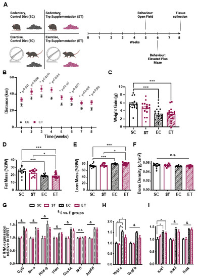 A tryptophan-supplemented diet increases physical activity in mice. (A) Schematic representation of the experimental design for the 8-week TRP-supplemented diet and exercise intervention. C57bl/6J mice were divided in 4 groups: sedentary with control diet (SC, 0.2% TRP; n = 13), sedentary with diet enriched in TRP (ST, 1% TRP; n = 13), with access to a running wheel and control diet (EC, 0.2% TRP; n = 15), with access to a wheel and TRP-enriched diet (ET, 1% TRP; n = 17). Behavior tests were performed at weeks 5 (open field) and 6 (elevated plus maze). Tissue collection was performed at week 8. (B) Distance ran in the wheels during the 8-weeks. (C) Weight-gain after the conclusion of the experiment. DEXA-scanning determination of (D) fat mass, (E) lean mass, and (F) bone density at the end of 8 weeks. Gastrocnemius muscle was used for qRT-PCR analysis of gene expression related to energy metabolism (G), angiogenesis (H), and kynurenine to kynurenic acid conversion enzymes (I). Gene expression data is normalized to the expression of a housekeeping gene (hypoxanthine phosphoribosyltransferase, HPRT) and presented as relative to sedentary control (SC). When not indicated n = 12–17, due to outlier exclusion. Data is presented as mean values ± standard error of the mean (SEM). * p < 0.05; *** p < 0.001; & Sedentary vs. Exercised p < 0.05.