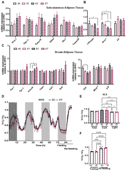 Metabolic analysis of molecular and phenotypic changes in energy expenditure. (A) qRT-PCR analysis of the expression of genes related to energy expenditure in subcutaneous adipose tissue from the different experimental groups, as described in Figure 1A (n = 11–17). (B) qRT-PCR analysis of genes related to inflammation in subcutaneous adipose tissue (n = 11–17). (C) qRT-PCR analysis of gene expression in brown adipose tissue. Gene expression data is normalized to the expression of a housekeeping gene (hypoxanthine phosphoribosyltransferase, HPRT) and presented as relative to sedentary control (SC) (n = 11–17). (D) Mice (n = 5 per group) were fed in their home cages for 5 weeks with either control diet (SC, 0.2% TRP) or TRP enriched diet (ST, 1% TRP). At week 6 of diet, mice were individually housed in the TSE PhenoMaster home cage system for 5 days with ad libitum access to food and water except for a 12 h fasting period during the last dark cycle (Fasting), followed by 8 h re-feeding (Re-feeding). Respiratory Exchange Ratio (RER) is calculated as the ration between the amount of produced CO2 (VCO2) and consumed oxygen (VO2). Quantification of the data shown in D for the (E) Dark and Light cycles or the (F) Fasting and Re-feeding period. Data is presented as mean values ± standard error of the mean (SEM). * p < 0.05; *** p < 0.001; **** p < 0.0001.
