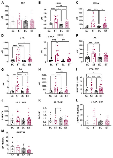 Plasma was collected and used to determine KP metabolite concentrations (Figure 3). Although we could not detect significant differences in circulating TRP levels, all KP metabolites were elevated in the ST vs. the CT group (Figure 3A–H). Interestingly, when compared to the ST group, the ET group showed lower levels of KYN, 3-HK, 3-HAA, and QA (Figure 3B,D,E,H).