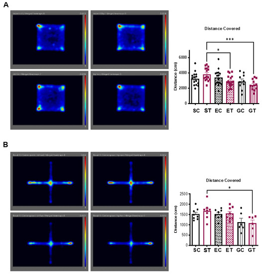 Moderate tryptophan-supplementation does not affect mouse behavior. As outlined in Figure 1A, the different mouse groups were submitted to (A) open field and (B) elevated plus maze tests. In addition, we added two other sedentary control groups consisting of group-caged animals fed the control (GC) or the TRP-supplementation diet (GT). Pictures show the merged images obtained for the different animals analyzed in the same round of tests (n = 6 to 9). Bar graphs show the average quantification of distance covered (n = 6 to 17) during the corresponding test. Data is presented as mean values ± standard error of the mean (SEM). * p< 0.05; *** p < 0.001.