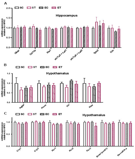 Animals were tested in an open field (Figure 4A and Supplementary Figure S5) and in an elevated plus maze test (Figure 4B and Supplementary Figure S6). Overall, we did not observe any significant differences between the groups, indicating that the exercise-mediated reduction in circulating KP metabolites, was not sufficient to affect mouse behavior (at least with the tests used). In line with these results, we did not detect any differences in the expression of hypothalamic or hippocampus genes related to changes in anxiety, inflammation, feeding behavior, and circadian regulation (Figure 5).