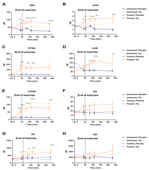 Tryptophan supplementation during exercise in high and low VO2 max human volunteers. Each subject performed the exercise protocol twice, either with Tryptophan (TRP) or placebo in a double-blind control setting. After resting, they exercised for 40 min at a given rate corresponding to their 60% VO2 max. Thereafter, they performed maximal exercise for another 10 min. In total, subjects were given a 1440 mL drink of flavored water (placebo) or containing 15 mg TRP/kg body weight, 10–15 min before exercise, just before exercise, at 15, 30, and 40 min of exercise, 5, 15, 30, 60, 90, 120, and 150 min of recovery. Blood was collected at rest (20 min before exercise), at 40 min of exercise, at the end of exercise (50 min) and then at 30, 60, and 180 min of recovery. Plasma was used for quantification of the indicated metabolites. (A) TRP, Tryptophan. (B) KYN, Kynurenine. (C) KYNA, Kynurenic acid. (D) 3-HK, 3-Hydroxykynurenine. (E) 3-HAA, 3-Hydroxyanthranilic acid. (F) AA, Anthranilic acid. (G) PA, Picolinic acid. (H) QA, Quinolinic acid. Data is presented as mean values ± standard error of the mean (SEM). * p < 0.05 (untrained placebo vs. trained TRP); # p < 0.05 (trained placebo vs. trained TRP); % p < 0.05 (untrained placebo vs. untrained TRP); € p < 0.05 (untrained TRP vs. trained placebo); = p < 0.05 (untrained TRP vs. trained TRP).