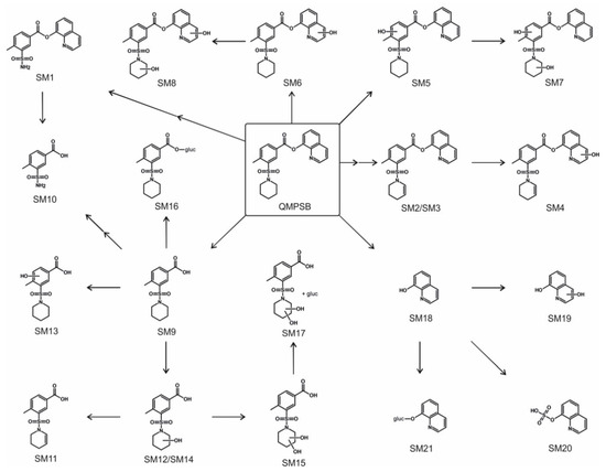 Metabolic pathways of QMPSB. SM1–SM21, metabolites of QMPSB; gluc, glucuronic acid.