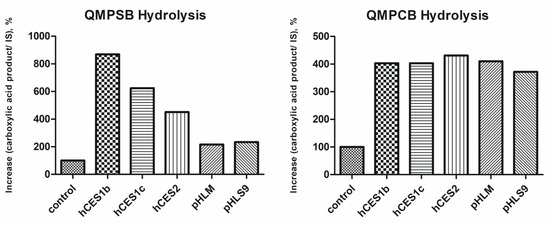 The ester hydrolysis product (carboxylic acid part) was measured to investigate the extent of ester hydrolysis. Therefore, the increase in the carboxylic acid product peak area normalized to the internal standard (trimipramine-d3) between 0 and 60 min of incubation time was determined. Results are shown in Figure 6. The control incubations of QMPSB and QMPCB show an increase in the ester hydrolysis products that must be the result of non-enzymatic ester hydrolysis. The increase in the carboxylic acid product of the control incubations was set to 100%, and all the other incubations were normalized (Figure 6).