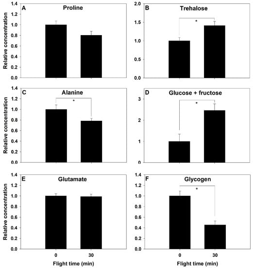 - Scaraffia, P.Y.; Wells, M.A. Proline can be utilized as an energy substrate during flight of Aedes aegypti females. J. Insect Physiol. 2003, 49, 591–601. [Google Scholar] [CrossRef]