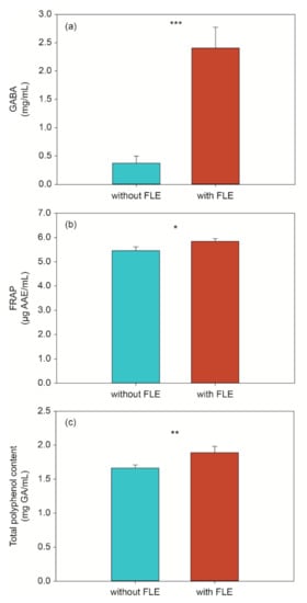 Level of (a) GABA, (b) antioxidant activity, and (c) total polyphenols in standard (without fermented lettuce extract (FLE)) and noodles with FLE (with FLE). The data are shown as the mean ± standard deviation and represent three replicate measurements. Significant difference set as * p < 0.05, ** p < 0.01, and *** p < 0.001.