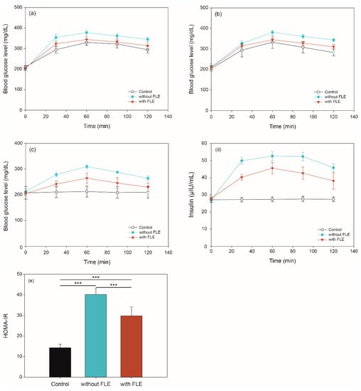 Blood glucose in (a) oral glucose, (b) sucrose tolerance, and (c) fasting blood glucose tests, as well as (d) insulin levels and (e) HOMA-IR values of mice given distilled water (control), feed standard noodles (without fermented lettuce extract [FLE]), and feed noodles with FLE (with FLE). Significant difference set as *** p < 0.001.