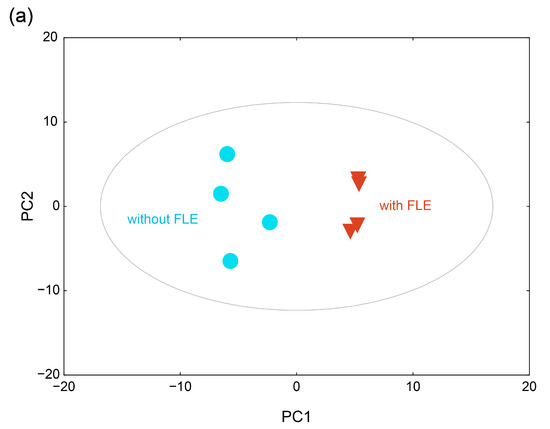 To investigate the metabolic differences between the group with standard and FLE noodles, principal component analysis (PCA) was conducted. The PCA score plot showed that the metabolite profiles of the groups with standard and FLE noodles were differentiated by principal component (PC) 1 and PC2 (Figure 3a). The variation value (R2X) and predictive capability (Q2X) of the model were 57.0% and 52.4%, respectively, based on cumulative values of PC1 and PC2, indicating a great quality of explanation and prediction [42]. The loadings of the 20 metabolites with relatively higher values, which represent how the identified metabolites contributed to the PC1 and PC2 generated by PCA, are listed in Table 3. Among the 83 metabolites, 37 metabolites, including oxamic acid, 1,5-anhydroglucitol, adenosine, glycerol, and pyruvate, contributed positively to PC1. However, 46 metabolites, including trehalose, isoleucine, uric acid, valine, and glutamate, contributed negatively to PC1. Forty-seven metabolites, including stearic acid, palmitate, oleic acid, and 1-monopalmitin, contributed positively to PC2, whereas 36 metabolites, including threonine, ornithine, myristic acid, and serine, contributed negatively to PC2.