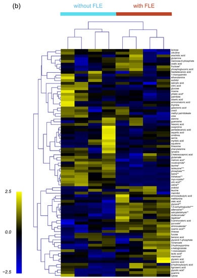 (a) Score plot of the principal component analysis (PCA) and (b) heatmap of hierarchical clustering analysis for the serum metabolite profiles of mice feed standard (without fermented lettuce extract (FLE)) and noodles with FLE. Significant differences were set as * p < 0.05, ** p < 0.01, and *** p < 0.001.