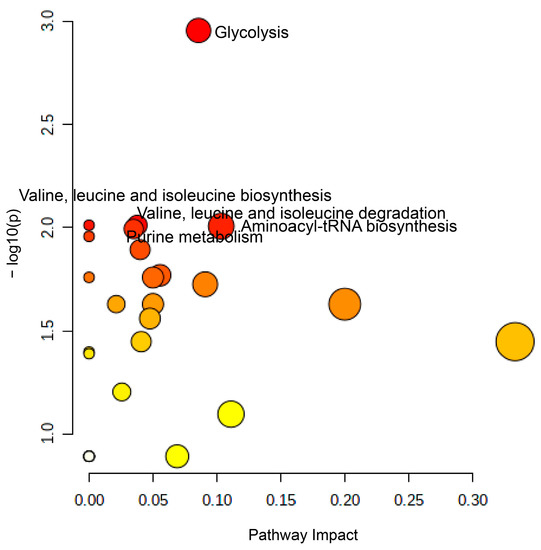 Summary of the pathway analysis results using MetaboAnalyst. The pathway impact (X-axis) and −logp-value (Y-axis) were calculated from the pathway topology analysis and pathway enrichment analysis, respectively. Glycolysis, valine, leucine, and isoleucine metabolism (BCAA metabolism), aminoacyl-tRAN biosynthesis, and purine metabolism were significantly different between mice serum for mice administered with standard and fermented lettuce extract (FLE) noodles at a significance level of p < 0.01, with adjusted false discovery rate (FDR) p-value < 0.05.