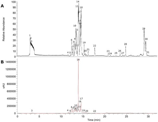 A UHPLC-high-resolution MS machine (Thermo Dionex Ultimate 3000 system with DAD detector controlled by Chromeleon 7.2 software hyphenated with a Thermo Q-Exactive MS focus) was used to analyze the phenolic compounds in the extract. For the analysis, 5 mg of the enriched extract were dissolved in 2 mL of methanol, filtered through a 200-µm polytetrafluoroethylene (PTFE) filter, and 10 µL were injected into the instrument [].