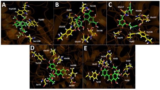 Due to the fact that Nuzhenal B bore a glycoside moiety in its structure, this derivative possesses the ability to carry out hydrogen bond interactions through the hydroxyl groups present at this core, but only one of these interactions are displayed by a hydroxy group of this framework with the amino acid Asp70 (Figure 5C). Given the above, Nuzhenal B arranged into the catalytic site through hydrogen bondings performed by a phenolic group and a carboxylate function of its structure. The residues implied in the four interactions mentioned above are Tyr128, Glu187, His438, and Gly117 (Figure 5C). Moreover, Nuzhenal B showed a π–π interaction with the indole ring of Trp82 and the phenolic moiety of its structure as already aforementioned. Myricetin O-rhamnoside and Luteolin 7-glucuronide, which share the 4H-chromen-4-one framework in their structures, also showed the best binding energy profiles. The latter could be attributed due to the fact that both derivatives showed more than five hydrogen bond interactions with the different residues of the butyrylcholinesterase catalytic site, either through the hydroxy functions at the pyrogallol framework in Myricetin O-rhamnoside or through the hydroxy groups at the catechol ring in Luteolin 7-glucuronide (Figure 5D,E). Additionally, the presence of glycosidic portions in both derivatives also allowed it to perform hydrogen bond interactions, but this core in Luteolin 7-glucuronide becomes more relevant as it carried out four interactions through its hydroxyl functions, alongside a special hydrogen bonding with the residue Ser198 and the deprotonated carboxylate that this moiety possesses (Figure 5E).