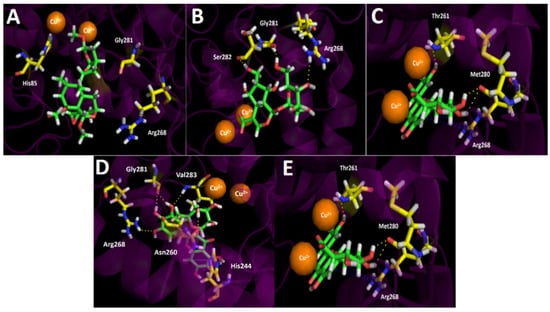 Predicted binding mode and predicted intermolecular interactions of the selected major compounds in Gaultheria pumila berries extract and the residues of the Agaricus bisporus mushroom tyrosinase catalytic site. Yellow dotted lines indicate hydrogen bond interactions, cyan dotted lines represent π–π interactions, red dotted lines indicate salt bridge interactions, and blue dotted lines indicate π-cation interactions. (A) Scupolin I in the catalytic site; (B) Unedide in the catalytic site; (C) Nuzhenal B in the catalytic site; (D) Myricetin O-rhamnoside in the catalytic site; and (E) Luteolin 7-glucuronide in the catalytic site.