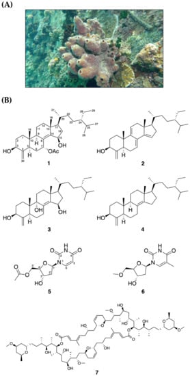 The freeze-dried material of the marine sponge Theonella sp. (Figure 1) was ground and extracted with ethyl acetate (EtOAc) to provide the crude extract. The crude extract was fractionated and purified on a series of normal-phase column chromatography affording seven compounds including theonellasterol L (1), theonellasterol B (2) [], theonellasterol E (3) [], theonellasterol (4) [], 5′-O-acetyl-2′-deoxyuridine (5) [], 5′-O-acetylthymidine (6) [], and swinholide A (7) []. Theonellasterol L (1) was found to be a novel compound belonging to the Theonella sp. biomarker group of compounds, 4-methylene sterols. The identified deoxyuridine and thymidine derivatives, 5′-O-acetyl-2′-deoxyuridine (5) and 5′-O-acetylthymidine (6), were reported for the first time from this sponge.