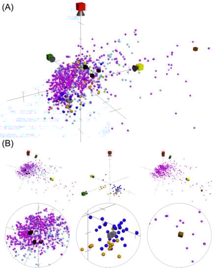 Mode of action (MOA)-relevant chemical patterns plotted by the isolates in the current study [4-methylene steroids (black), nucleosides (grey), and macrolide (brown)], as well as the clinical and preclinical chemotherapeutic agents, including alkylating agents (blue, 31 compounds), anti-metabolites (orange, 24 compounds), proteasome inhibitors (light blue, 457 compounds), tyrosine kinase inhibitors (light green, 102 compounds), topoisomerase (purple, 8 compounds), and anti-microtubule agents (pink-purple, 642 compounds) sorted from the ChEMBL database. The score plot of the three dimensions (principle component) was marked with PC1 (yellow) describing the size, shape, and polarizability; PC2 (green) representing the aromatic- and conjugation-related properties; PC3 (red) depicting lipophilicity, polarity, and H-bond capacity. (A) The overall view of analysis; (B) the individual view of each type of compound.