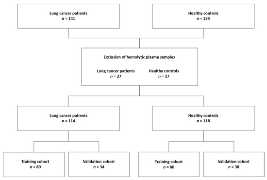 Subjects for the model training and validation. Plasma samples from 276 donors were analyzed, but hemolytic plasma samples (n = 44) were excluded from the dataset. Finally, 160 subjects (80 lung cancer patients and 80 healthy controls) were selected for the training cohort while the remaining 72 subjects (34 lung cancer patients and 38 healthy controls) were used for an independent validation of the trained classification model (Figure 5).