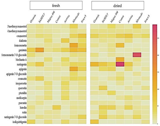 - Tucak, M.; Čupić, T.; Horvat, D.; Popović, S.; Krizmanić, G.; Ravlić, M. Variation of Phytoestrogen Content and Major Agronomic Traits in Alfalfa (Medicago sativa L.) Populations. Agronomy 2020, 10, 87. [Google Scholar] [CrossRef] [Green Version]