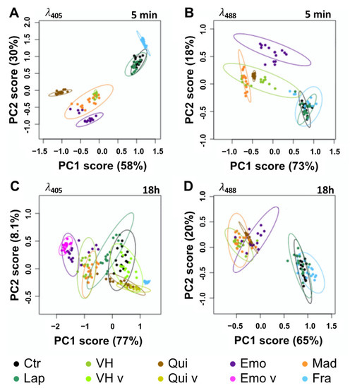 In particular for anthranoids, it was found that their localization and emission spectra did not change significantly over time. Nevertheless, at λ405, the shape of the emission spectrum in Mad-treated cells was found to be closely related to that of VH (Figure 4A,D). Other treatments have also been associated either with the appearance of a new fluorescence emission signal in the primary vacuole (Figure 4A–C and Figure S10A–C), or to the translocation of an identical fluorescence signal from the nucleus into the primary vacuole as seen in Fra-treated cells (Figure 4E and Figure S10E). These results were further validated by a PCA analysis of the normalized average spectra (Figure 5C,D, Figures S11C,D and S13C,D), giving rise to clustering of fluorescence spectra according to putative structural similarities between the tested molecules in BY-2 cells. For instance, at λ488 (Figure 5D), the normalized average spectra of anthranoid-treated cells clustered, indicating that anthraquinones fluorescence was observed in contrast to Ctr, Lap, and Fra, which do not fluoresce under these conditions. In addition, normalized average spectra collected at λ405 (Figure 5C) and at λ488 (Figure 5D) within the cytoplasm, ER and vesicular bodies in VH, and Mad-treated cells were found to be similar and even closer after 18 h (Figure 5C,D) than after 5 min (Figure 5A,B). Therefore, they clustered in the PCA analysis. Conversely, the Emo normalized average spectra are significantly different at λ405 (Figure 5C) and slightly less different at λ488 (Figure 5D).