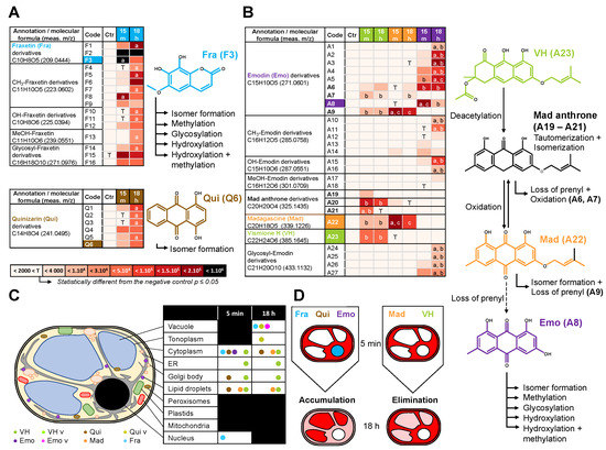 In VH-, Mad-, Emo-treated cells, the Emo (A8) and eight of its derivatives (A1–A7, A9) were detected (Figure 6C, Table S5). In addition, five methylated (A10–A14), two hydroxylated (A15, A16), two methoxylated (A17, A18), and four glycosylated (A24–A27) Emo derivatives were significantly detected only in Emo-treated cells. Surprisingly, Emo and its A1–A6 derivatives were almost exclusive of Emo-treated cells and after 18 h the A1–A5 abundance significantly increased. In contrast, the Emo derivatives A7 and A9 were specific to Mad and VH-treated cells. This agrees with SImaging and PCA results obtained for Emo-treated cells at 5 min and 18 h. Indeed, the fluorescence observed mostly in the cytoplasm at λ405 and λ488 corresponds to a specific spectral fingerprint of Emo and more likely to A6 content that is unchanged in our metabolomic data at both 15 min and 18 h. In contrast, it can be proposed that the fluorescence observed in the primary vacuole at λ405 after 18 h, is from a mixture of the most hydrophilic derivatives (A1–A5), glycosylated (A24, A25) or hydroxylated (A15, A16) forms, being significantly increased after 18 h as compared to 15 min (Figure 6C,D). Other metabolites such as VH (A23) as well as Mad anthrone and two putative isomers (A19–A21) were only detected in VH-treated cells, while Mad (A22) was found in VH and Mad-treated cells.