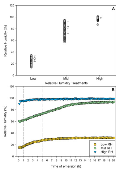 During emersion, relative humidity (RH) was consistently above 90% for the high RH treatment, with an average RH of 98 ± 2% (SD, n = 242; Figure 1A). In contrast, RH for low and mid RH treatments was more variable. Low and mid RH treatments started at approximately 15 and 60%, respectively, but average values over 20 h were, respectively, 29 ± 5% and 82 ± 11% (SD, n = 242 for each mean; Figure 1A). RH in the low RH treatment was 16 ± 2% during the first hour of emersion, increasing to 22 ± 4% after 5 h of emersion and then to a maximum value of around 32% by the end of the 20 h of emersion (Figure 1B). RH in the mid RH treatment was 61 ± 1% during the first hour of emersion and increased to 67 ± 4% after 5 h of emersion, before reaching a maximum value of around 94% by the end of the 20 h emersion period (Figure 1B).