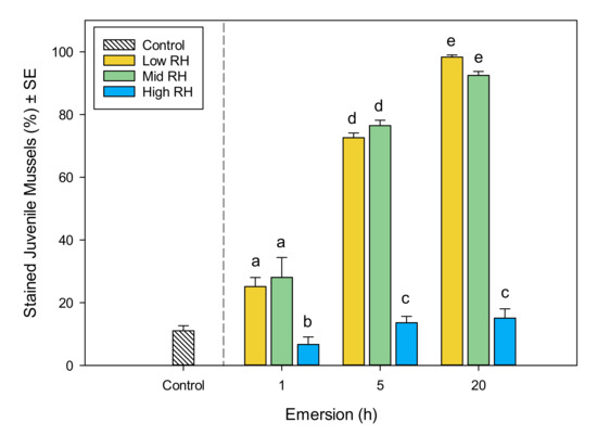 Fast Green staining of juvenile Perna canaliculus exposed to different relative humidity (RH; low, mid, high) and emersion (1, 5, 20 h) treatments, followed by 10 h recovery in seawater. Control bar shows percentage of stained mussels that were continuously immersed in flowing seawater (excluded from statistical analysis). Data represent the mean percent of stained mussels ± standard error (SE, n = 5). Tukey pair-wise comparisons show significant differences (p < 0.05) for the interaction between emersion time and relative humidity treatments, which are denoted by different lower-case letters above bars.